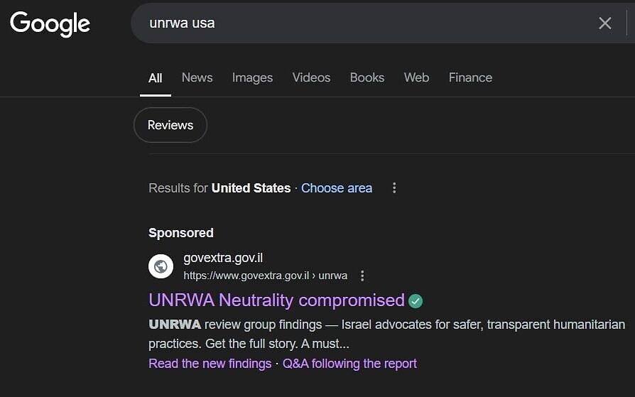 Picture of a Google search results showing anti-UNRWA rhetoric using Google ads.