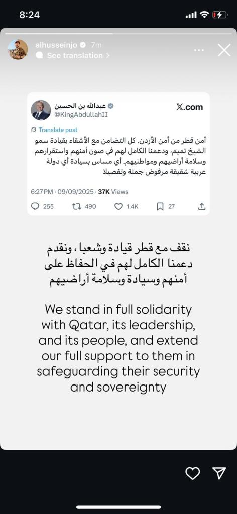 The Crown Prince shared a message from King Abdullah II on Instagram Stories, emphasizing that “Qatar’s security is integral to Jordan’s security.”