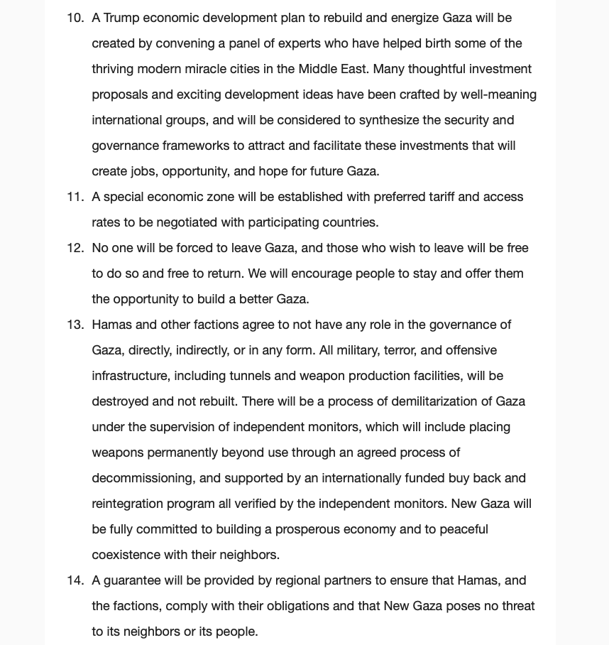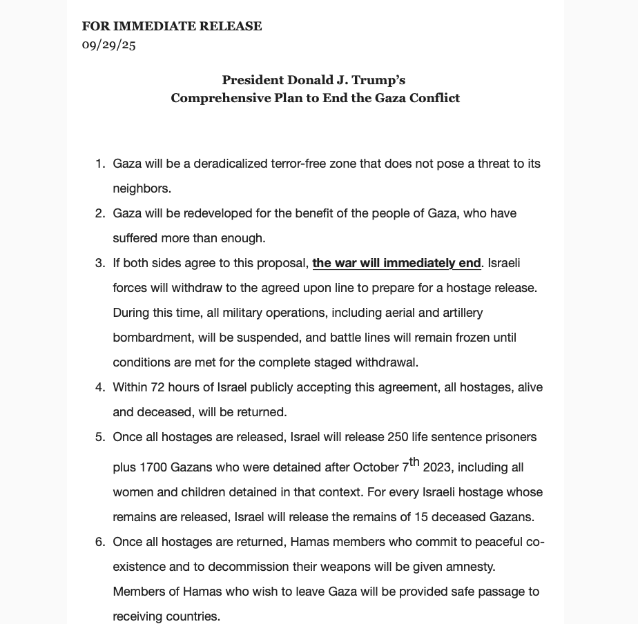 - Once all hostages are returned, Hamas members who commit to peaceful co-existence and to decommission their weapons will be given amnesty. Members of Hamas who wish to leave Gaza will be provided safe passage to receiving countries.
