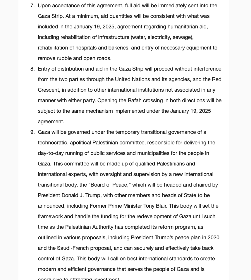 - Gaza will be governed under the temporary transitional governance of a technocratic, apolitical Palestinian committee, responsible for delivering the day-to-day running of public services and municipalities for the people in Gaza. This committee will be made up of qualified Palestinians and international experts, with oversight and supervision by a new international transitional body, the “Board of Peace,” which will be headed and chaired by President Donald J. Trump, with other members and heads of State to be announced, including Former Prime Minister Tony Blair. This body will set the framework and handle the funding for the redevelopment of Gaza until such time as the Palestinian Authority has completed its reform program, as outlined in various proposals, including President Trump’s peace plan in 2020 and the Saudi-French proposal, and can securely and effectively take back control of Gaza. This body will call on best international standards to create modern and efficient governance that serves the people of Gaza and is conducive to attracting investment.