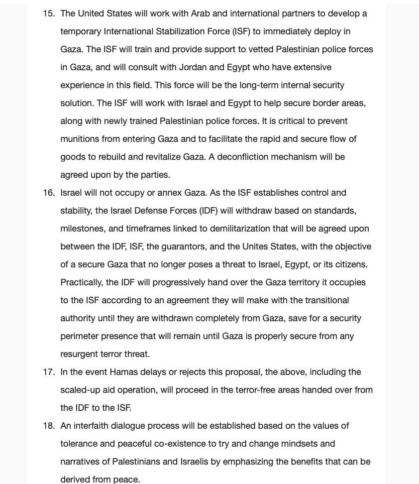 - The United States will work with Arab and international partners to develop a temporary International Stabilization Force (ISF) to immediately deploy in Gaza. The ISF will train and provide support to vetted Palestinian police forces in Gaza, and will consult with Jordan and Egypt who have extensive experience in this field. This force will be the long-term internal security solution. The ISF will work with Israel and Egypt to help secure border areas, along with newly trained Palestinian police forces. It is critical to prevent munitions from entering Gaza and to facilitate the rapid and secure flow of goods to rebuild and revitalize Gaza. A deconfliction mechanism will be agreed upon by the parties.
