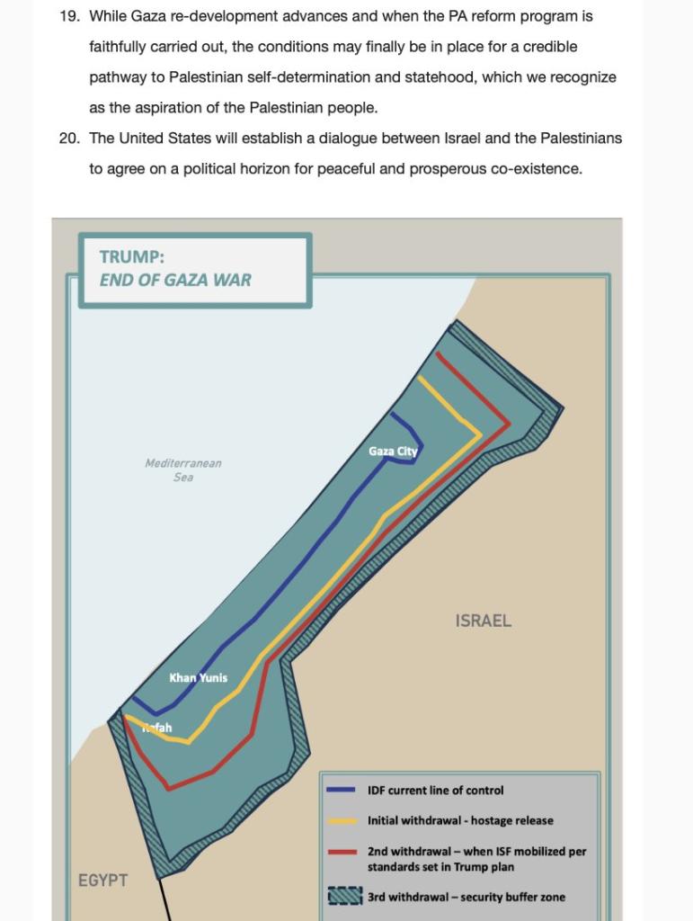 - Israel will not occupy or annex Gaza. As the ISF establishes control and stability, the Israel Defense Forces (IDF) will withdraw based on standards, milestones, and timeframes linked to demilitarization that will be agreed upon between the IDF, ISF, the guarantors, and the Unites States, with the objective of a secure Gaza that no longer poses a threat to Israel, Egypt, or its citizens. Practically, the IDF will progressively hand over the Gaza territory it occupies to the ISF according to an agreement they will make with the transitional authority until they are withdrawn completely from Gaza, save for a security perimeter presence that will remain until Gaza is properly secure from any resurgent terror threat.