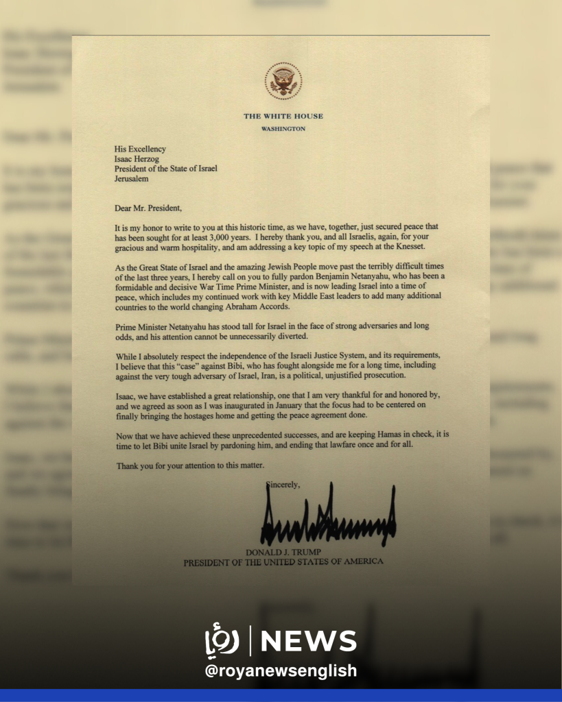 - Trump asks 'Israeli' President Herzog to pardon Netanyahu, calling the charges “political.”
