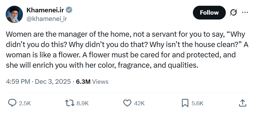 “Women are flowers”: Khamenei’s tweet goes viral on X