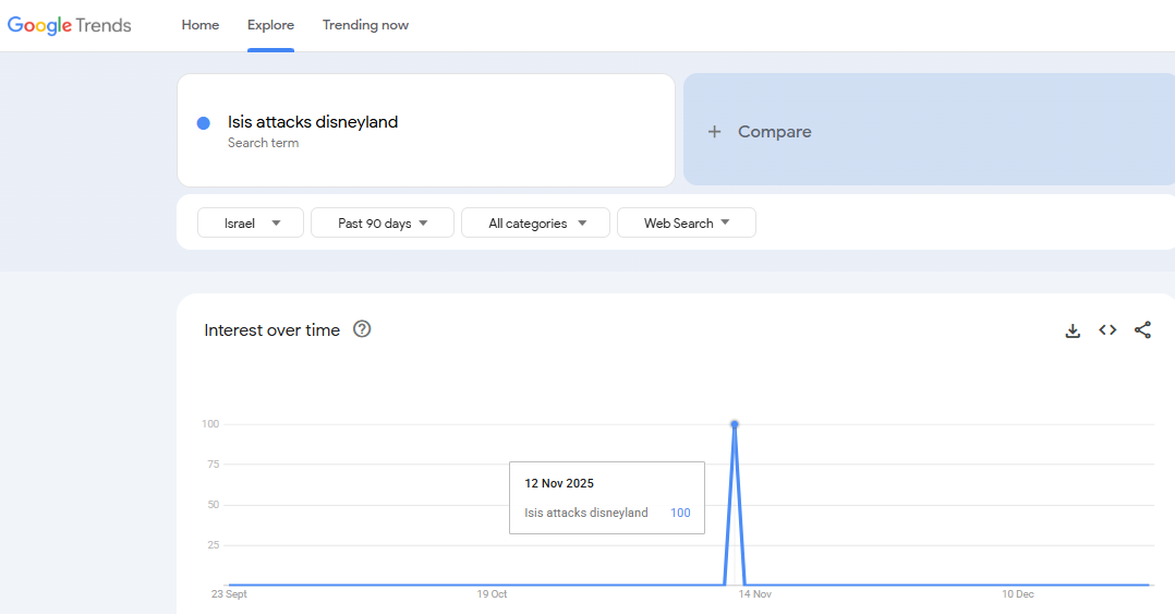 - On Nov 12, 2025, nearly 100 Google users in 'Israel' searched for “ISIS attacks Disneyland,” sparking social media controversy.