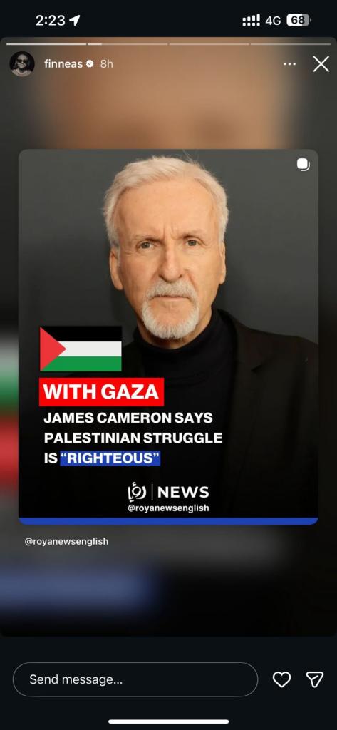 Finneas reposted an article summarizing Cameron’s recent remarks in which the Avatar director described the situation facing Palestinians as “existential,” drawing parallels between fictional narratives of colonization and real-world conflicts, including the war on Gaza.
