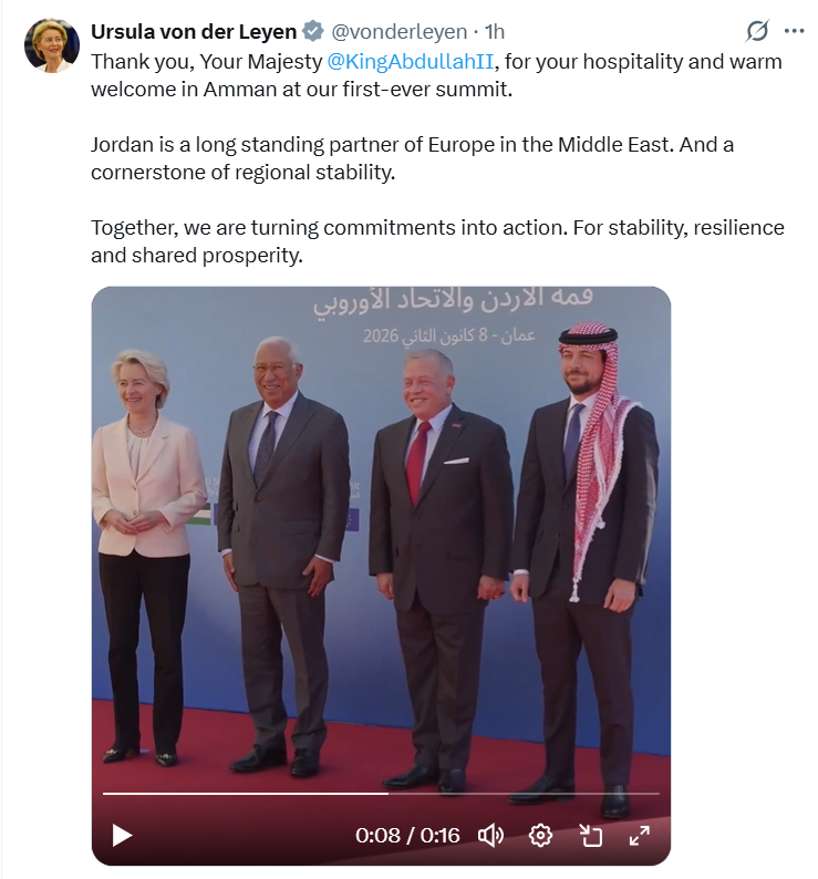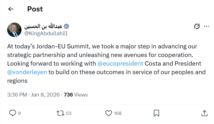 His Majesty King Abdullah II posted on X: “At today’s Jordan-EU Summit, we took a major step in advancing our strategic partnership and unleashing new avenues for cooperation. Looking forward to working with @eucopresident Costa and President @vonderleyen to build on these outcomes in service of our peoples and regions.”