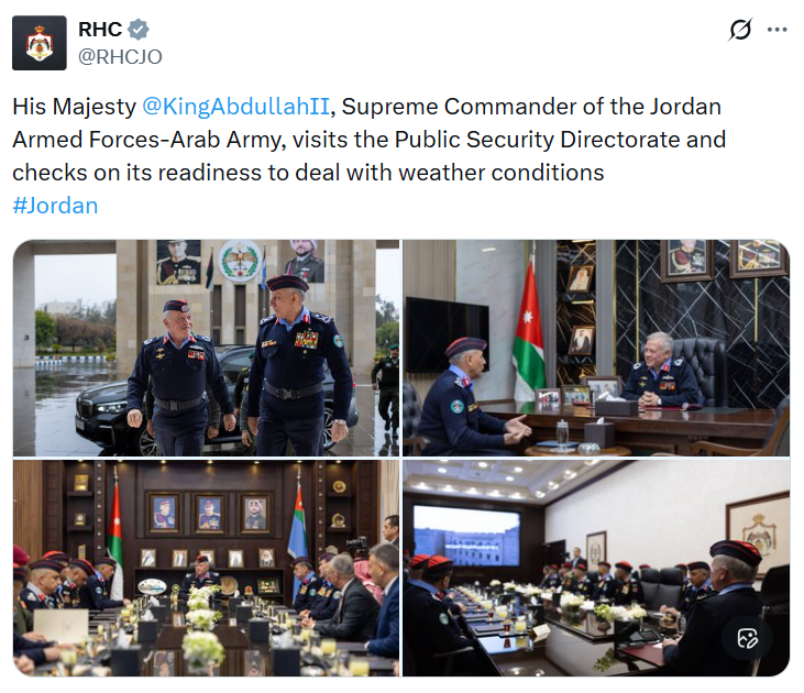 His Majesty King Abdullah II, the Supreme Commander of the Jordan Armed Forces-Arab Army, visited the Public Security Directorate (PSD) on Tuesday and checked on its preparations for dealing with winter weather conditions, and its key security plans and strategies.