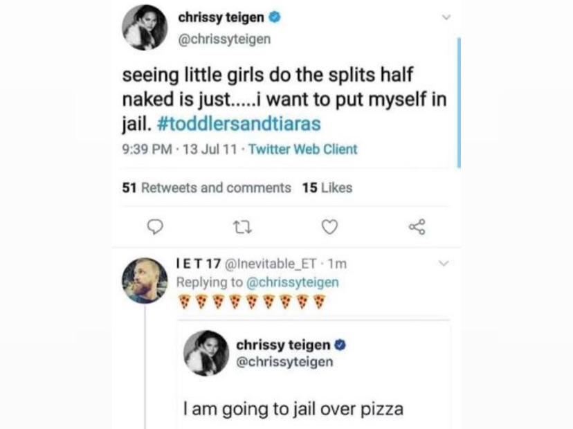 - Teigen's tweets about “pizza” are simply about pizza and are not code for anything else.