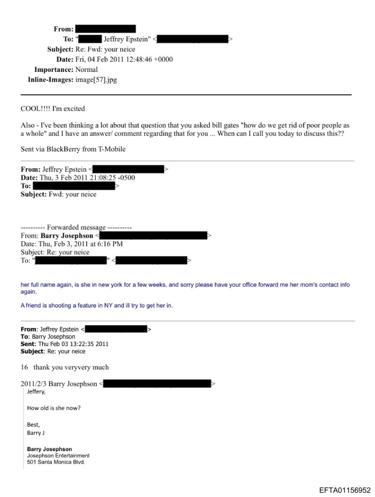 - A 2011 email unsealed in February 2026 reveals Epstein allegedly asked Bill Gates, "how do we get rid of poor people as a whole," a remark producer Barry Josephson followed up on in a thread that disturbingly pivoted to a 16-year-old girl.