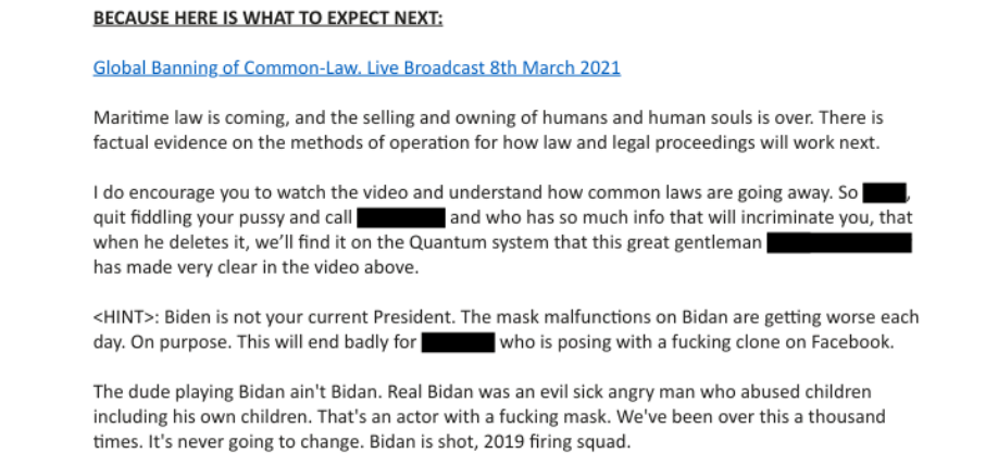 The “Charles” emails were forwarded to an FBI agent in April 2021 by a redacted sender, who claimed to be relaying messages from a disgruntled former employee or associate of a technology firm. The texts contain profane language and reference alleged “quantum” technologies, secret military tribunals, and claims that “Biden is not your current President.”