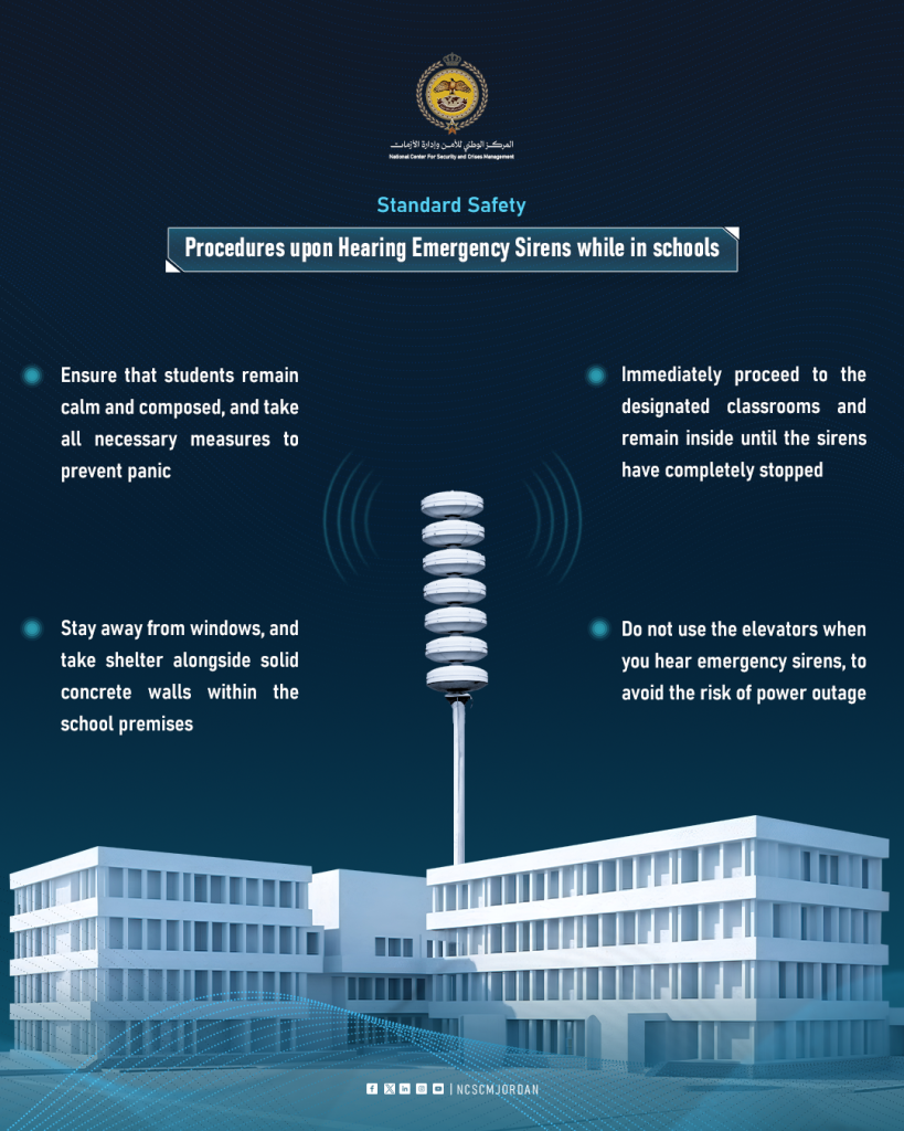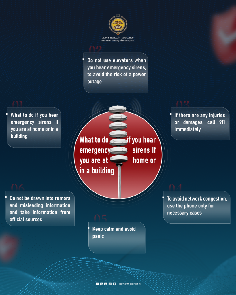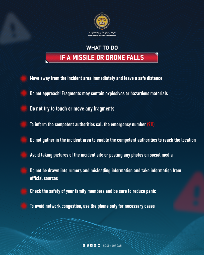 The Jordanian Public Security Directorate released an advisory Saturday providing citizens with guidance on responding to air raid sirens and unfamiliar or potentially explosive objects.