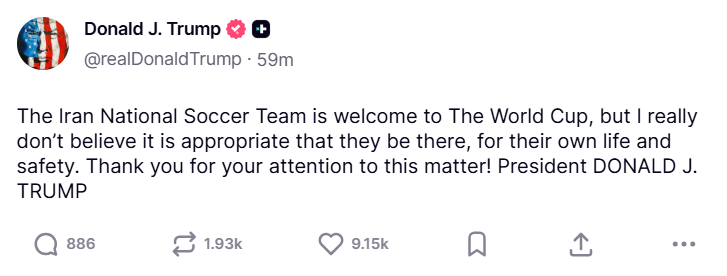 "The Iran National Soccer Team is welcome to The World Cup, but I really don't believe it is appropriate that they be there, for their own life and safety," Trump said on his Truth Social platform.