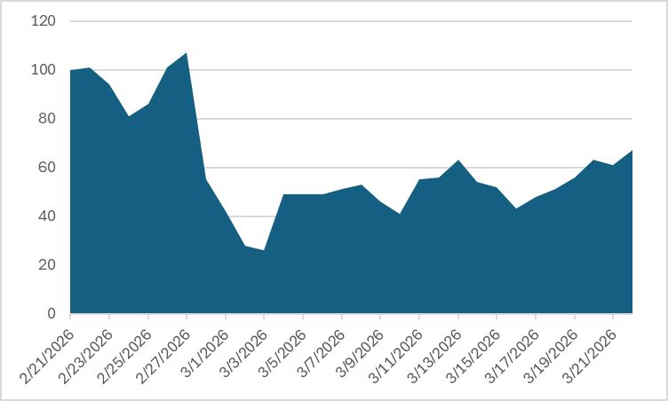 Flight activity at Amman reached 65% of normal operations as of March 22, with 67 flights tracked on that day. Flight numbers at the airport have steadily increased since a low point in early March, when daily flights fell to 26 on March 3. Daily flight counts fluctuated slightly in the following weeks, with activity gradually returning to pre-disruption levels.