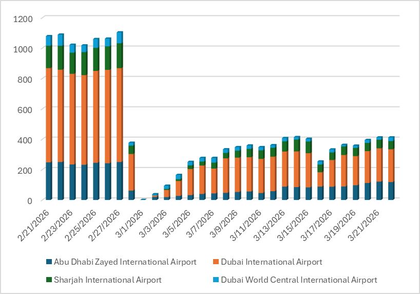 - UAE airports: 412 flights on March 22 (~37% of normal activity)