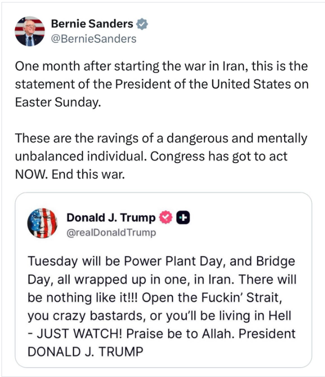 Sanders’ comments came in response to a post attributed to Trump in which he warned of possible strikes targeting infrastructure in Iran. The message referenced what he described as “Power Plant Day” and “Bridge Day,” alongside a demand related to the Strait of Hormuz.