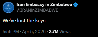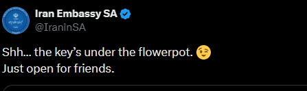 The Iranian Embassy in Zimbabwe kicked off the campaign with a cryptic four-word message: “We’ve lost the keys.” The embassy in South Africa responded with a winking emoji, revealing the key was “under the flowerpot,” but “open for friends.”