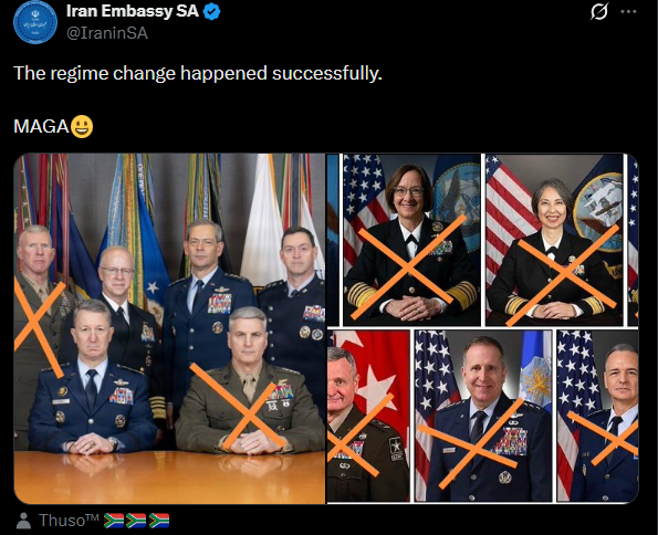 Embassies directly targeted US political and military figures. In India, Tehran’s mission called Donald Trump a “sore loser brat” and “old man” in response to a statement about the Strait of Hormuz. The South African mission posted images of senior US military officials with faces crossed out, sarcastically claiming “successful regime change” alongside the slogan “MAGA,” and dismissed American victories as “only in Hollywood.”