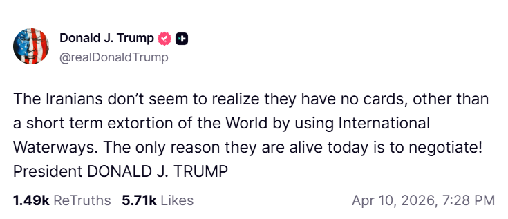 Trump also claimed Iran’s use of maritime routes amounted to “extortion of the world,” while insisting that negotiations remain the only viable path forward.