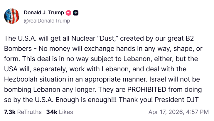 Trump had said that “Israel will not be bombing Lebanon any longer” and that such actions were “PROHIBITED” by the United States, language that 'Israeli' officials viewed as contradicting the publicly released terms of the ceasefire agreement.