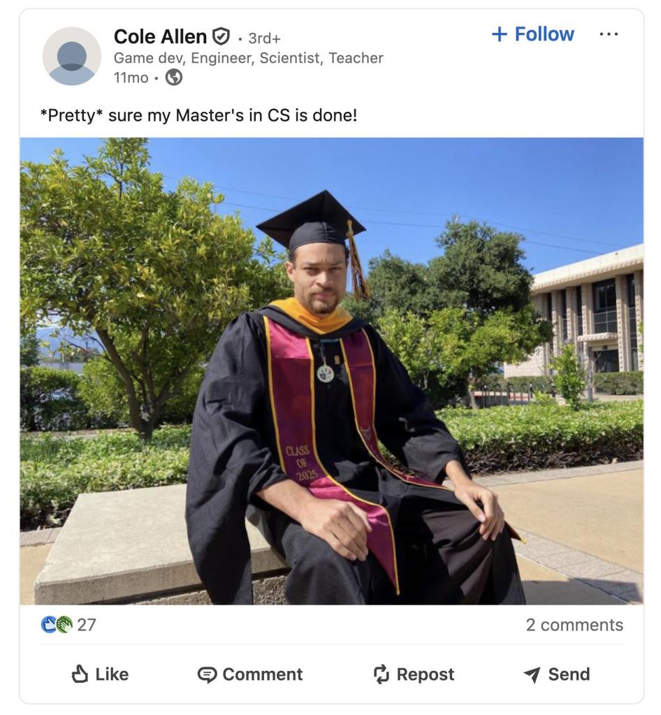 Allen also has a master’s degree in computer science at Cal State Dominguez Hills in 2025, according to a report by the Los Angeles Times.