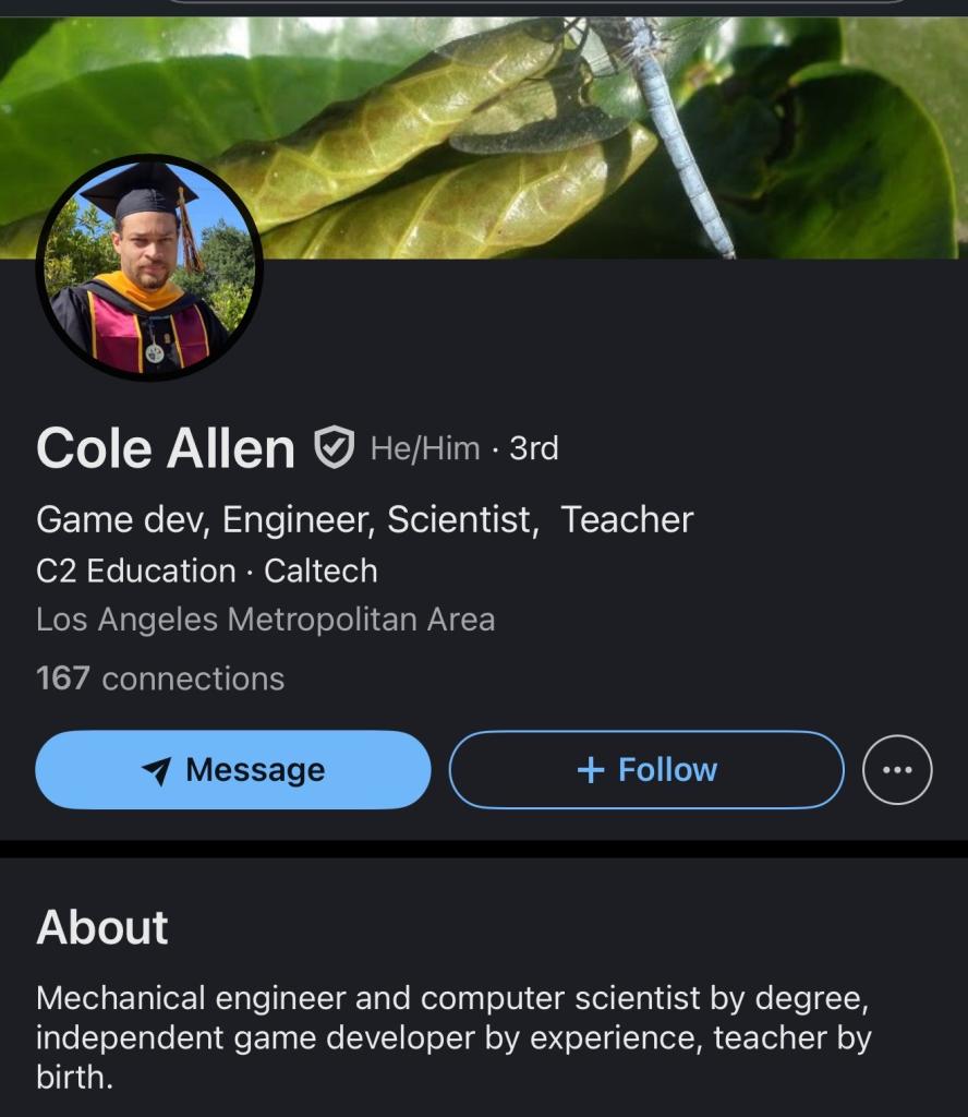 His -unverified- LinkedIn profile describes him as a mechanical engineer, computer scientist, indie game developer, and part-time teacher based in the Los Angeles area.